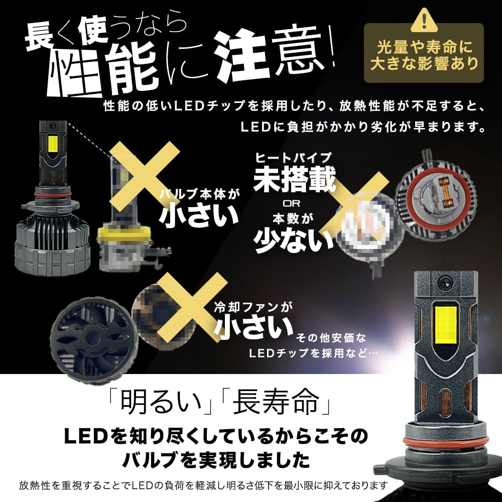 また、発光効率が良いバルブや小型ボディ、放熱構造がシンプルなLEDは高温になりやすく、光量や寿命に大きく影響します。